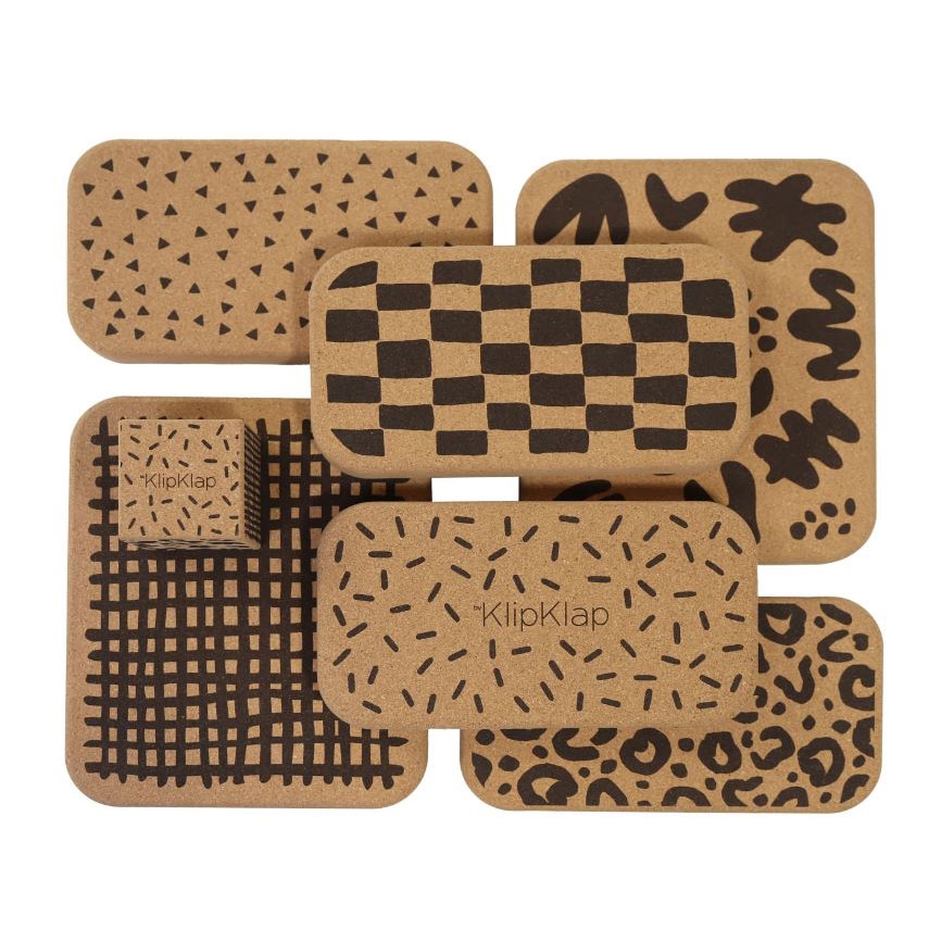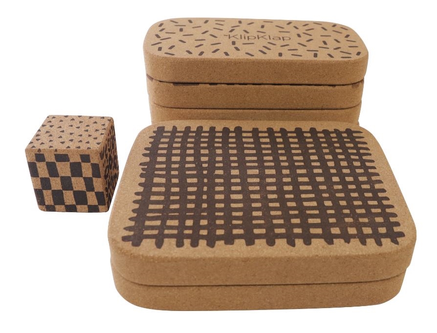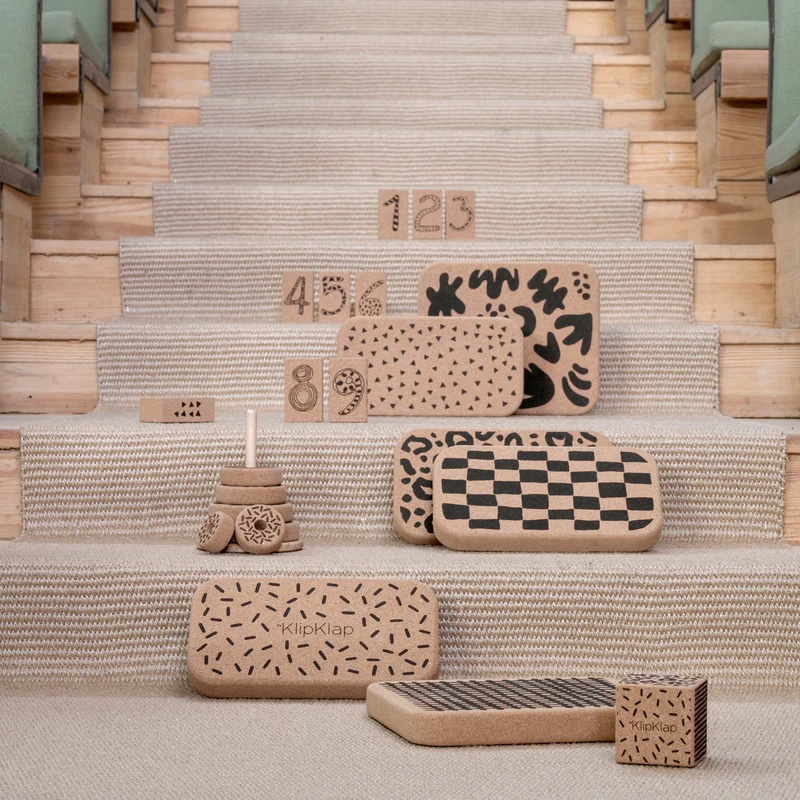 Kork er et holdbart materiale, der er behageligt at røre ved og giver en skridsikker overflade. Det gør stepping stones sikre at bruge, selv når dit barn hopper og balancerer. De forskellige mønstre – fra trekanter til abstrakte former – tilføjer visuel variation og inviterer til fantasifuld leg.