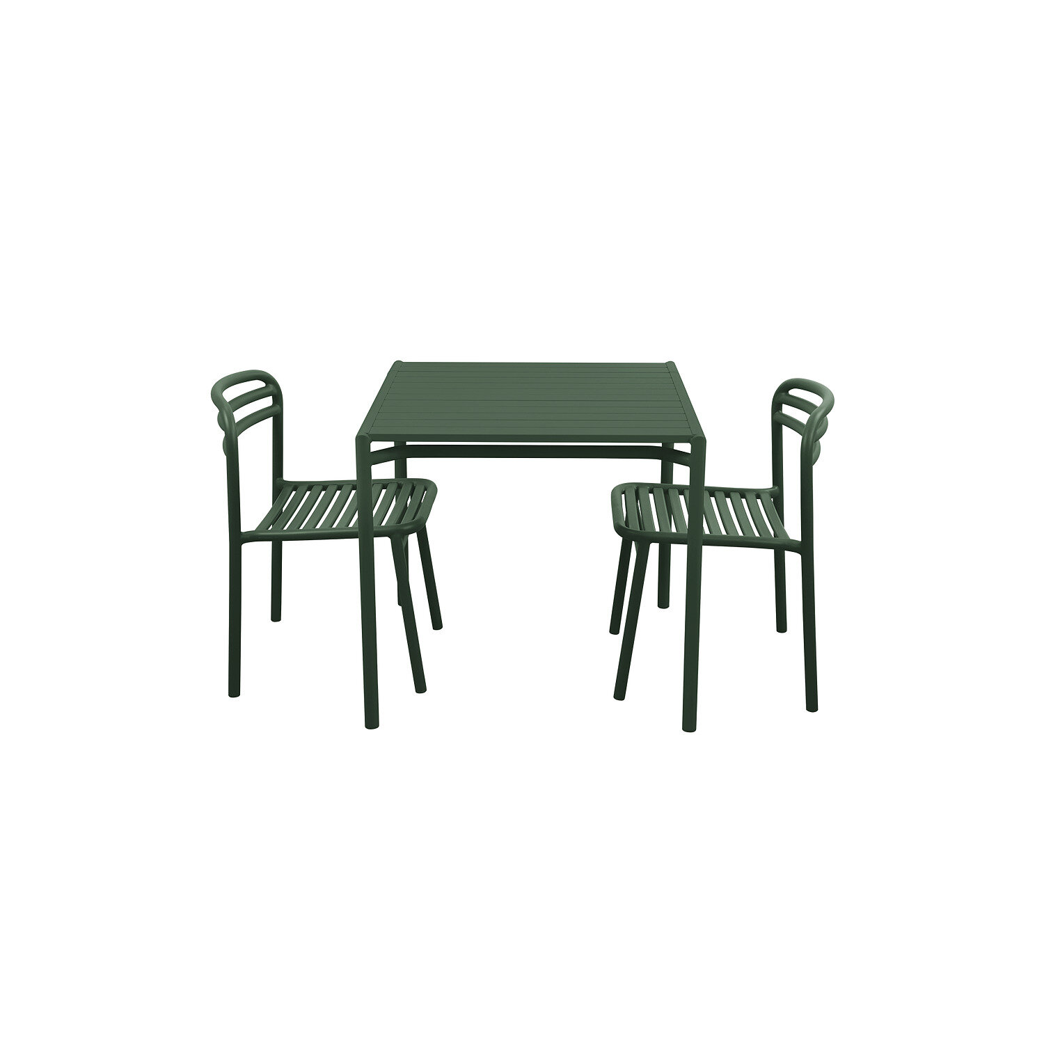 Dette udendørs spisesæt fra Cane-Line er designet til det danske vejr. Møblerne er lavet af holdbart aluminium med en mørkegrøn finish, som kræver minimal vedligeholdelse.