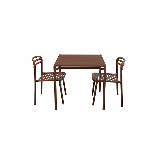 Dette udendørs spisesæt i Desert Red kommer færdigsamlet og klar til brug. Sættet passer til to personer og er designet til at holde til al slags vejr. Stolene har en sædehøjde på 46 cm og en sædedybde på 44 cm.