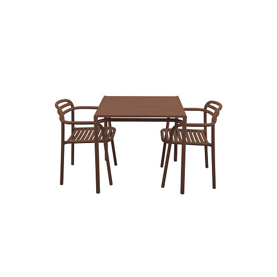 Stolenes mål sikrer en behagelig siddestilling under lange middage udendørs. Bemærk, at bordet ikke har hul til parasol eller hjul, og møblerne kan ikke stables eller foldes sammen. Dette giver stabilitet i din udendørsindretning.