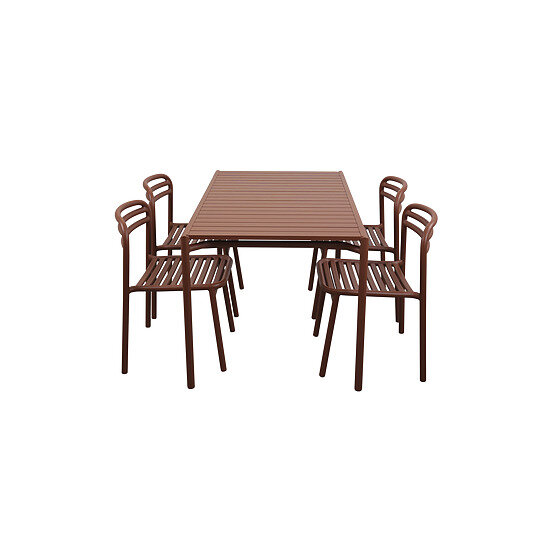 Dette havemøbelsæt består af et rektangulært bord og fire stole i et holdbart materiale med en karakteristisk farve i desert red. Sættet er klar til brug ved levering.