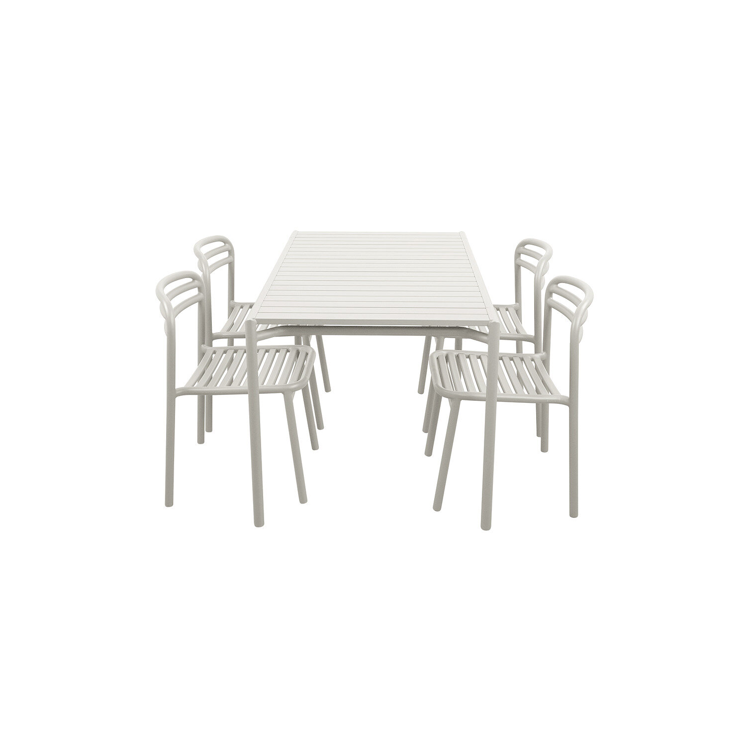 Dette udendørs spisesæt giver dig et bord og fire stole i aluminium. Bordet måler 133 x 81 cm, hvilket giver plads til måltider og samvær.