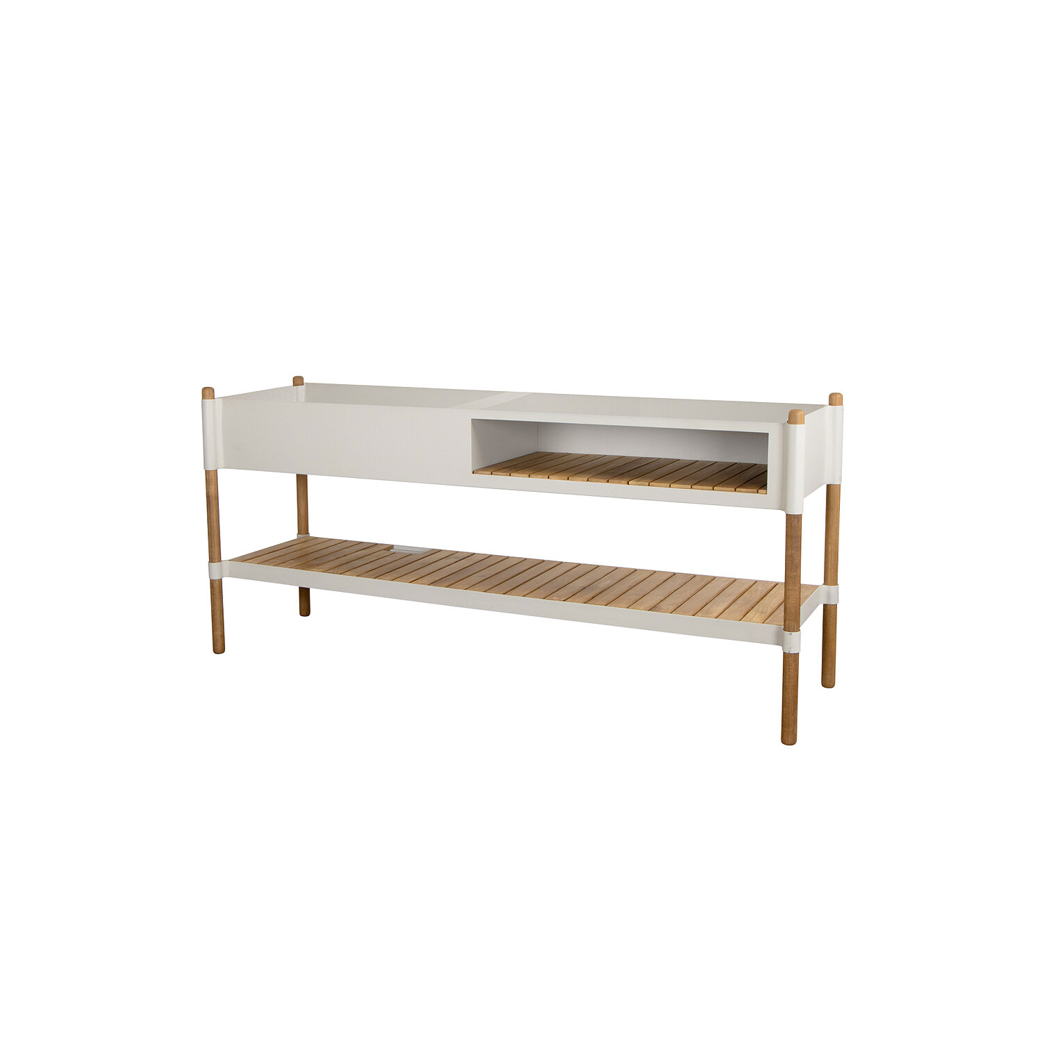 Cane-Line Sticks køkkenmodul i sandfarvet aluminium med teaktræshylde er designet til udendørs brug. Det minimalistiske design kombinerer moderne æstetik med funktionalitet og holdbarhed, hvilket gør det ideelt til udendørs madlavning og opbevaring.
