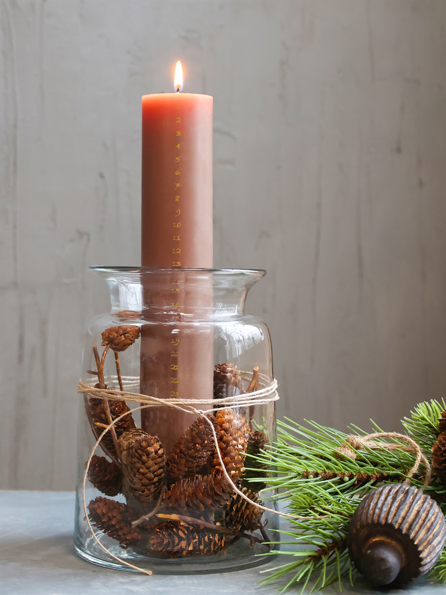Helt enkelt og super hyggeligt kalenderlys fra Chic Antique med fine tal i guld. Lav en dekoration med fx grangrene, julekugler, mos og hvad der ellers vil pryde en juledekoration.