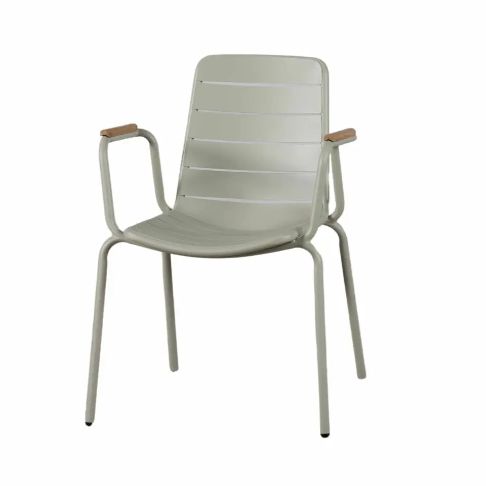 Denne havestol fra Cinas kombinerer teaktræ og aluminium i et moderne design. Armlænene er fremstillet af teaktræ, som har en naturlig modstandsdygtighed mod vejrpåvirkninger. Stellet er pulverlakeret i lysegrå, hvilket giver en holdbar overflade til udendørs brug året rundt.