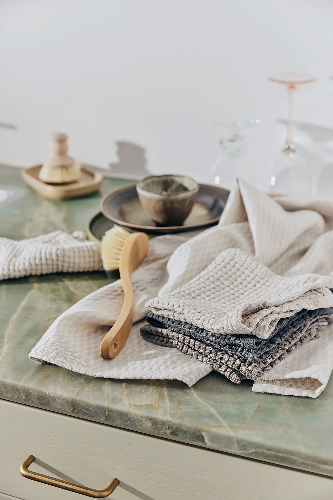 Sættet indeholder tre klude i jordnære farver: creme, beige og mørkegrå. De neutrale nuancer passer naturligt ind i de fleste køkkener, og den praktiske størrelse gør dem nemme at have ved hånden til daglig rengøring.