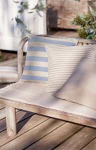Stribet udendørspude i sand og beige. Match med puderne Outdoor Basic og Outdoor Stripe, og skab den skønneste oase i haven og på terrassen. Outdoor Fine Stripe er lavet i special stof, som er vandafvisende og tåler solens stråler. Perfekt og let at tage med, når du skal nyde en god dag på stranden.
