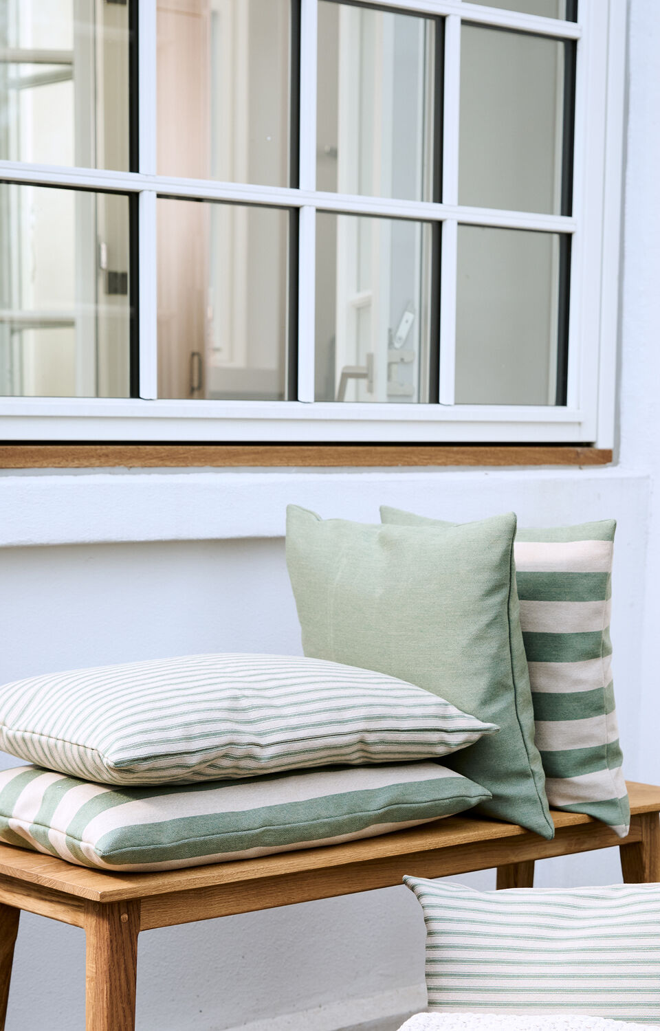 Trendy udendørspude med grønne striber. Match med puderne Outdoor Basic og Outdoor Stripe, og skab den skønneste oase i haven og på terrassen. Outdoor Fine Stripe er lavet i special stof, som er vandafvisende og tåler solens stråler. Perfekt og let at tage med, når du skal nyde en god dag på stranden.