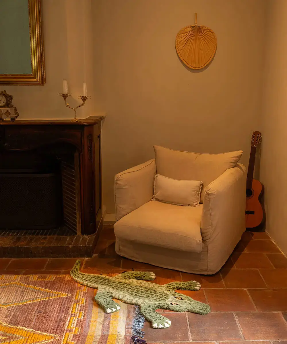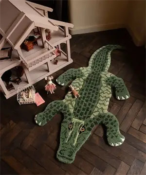 Dette gulvtæppe er formet som en krokodille med detaljerede mønstre i grønne nuancer, der efterligner krokodilleskind. Håndlavet i 100 % uld tilbyder tæppet en følelse af kvalitet og holdbarhed, der kan holde til daglig brug i børneværelset.