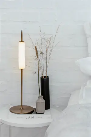 Ekta Living bordlampe Dunhammer kombinerer håndværk med funktionel belysning. Med sine mål på 17 x 58 cm passer den ind på smalle konsolborde og natborde, hvor pladsen er begrænset. Opalglas og messing giver lampen et udtryk, der holder gennem årene.