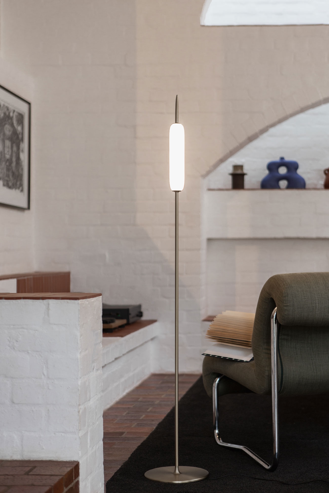 Opalglas og messing er valgt for deres holdbarhed og æstetiske kvaliteter. Opalglasset giver et blødt, diffust lys uden hårde skygger, mens messingkonstruktionen sikrer stabilitet. Vægten på 3,7 kg betyder, at lampen står sikkert på gulvet, selv i rum med trafik.