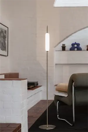 Denne gulvlampe fra Ekta Living har en slank profil på 143 cm i højden og 23 cm i diameter. Farven bronzed brass giver en varm, metallisk tone, der passer ind i moderne indretninger. Lampen er fremstillet i messing med en cylindrisk lyskilde i opalglas.