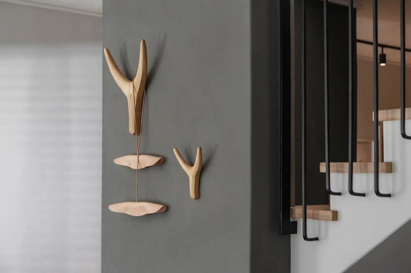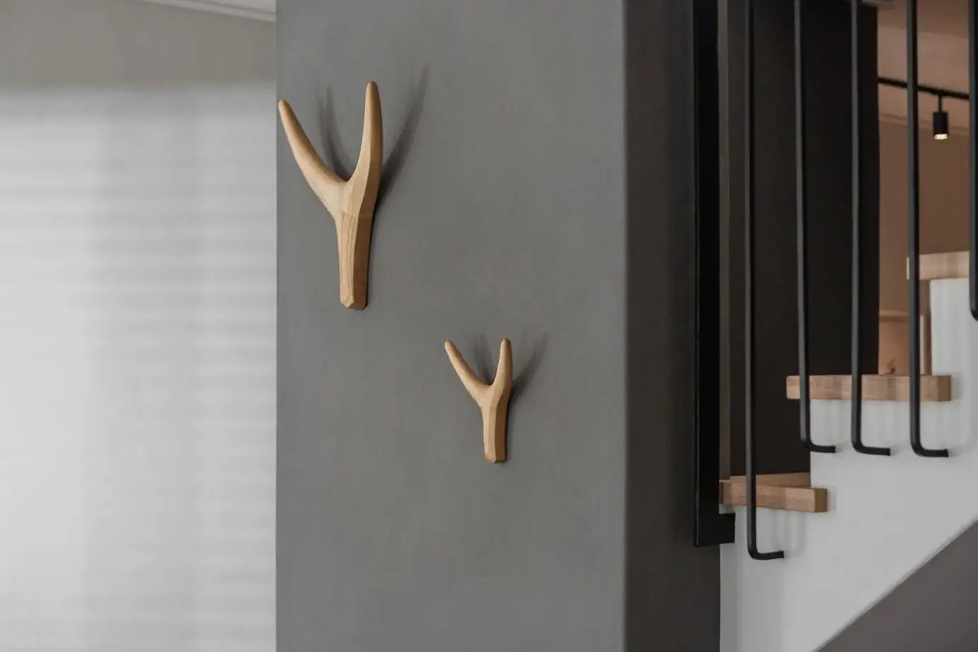 Denne vægknage er håndlavet i asketræ, et materiale der er værdsat for sin styrke og karakteristiske åremønster. Med sit Y-formede design bringer den et skulpturelt element til din væg, samtidig med at den giver praktisk opbevaringsplads til jakker, tasker eller tørklæder.