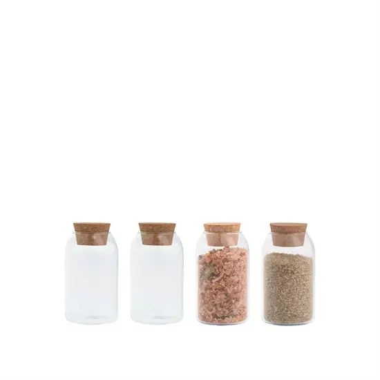 Disse krydderikrukker kombinerer glas og kork til en funktionel opbevaringsløsning. Glasset giver dig mulighed for at se indholdet med et blik, mens korklågene sikrer en tæt forsegling, der holder dine krydderier friske længere. Sættet inkluderer fire krukker, så du kan organisere flere krydderier på én gang.