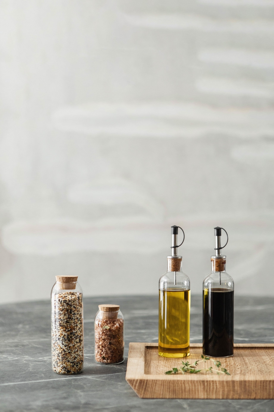 Flaskerne er lavet af glas, som er nemt at rengøre og forbliver klare over tid. Korkpropperne sikrer en tæt lukning, mens metaldetaljerne giver stabilitet. Kombinationen af disse materialer gør flaskerne velegnede til daglig brug i køkkenet, hvor de kan stå fremme på bordet eller opbevares i skabet.