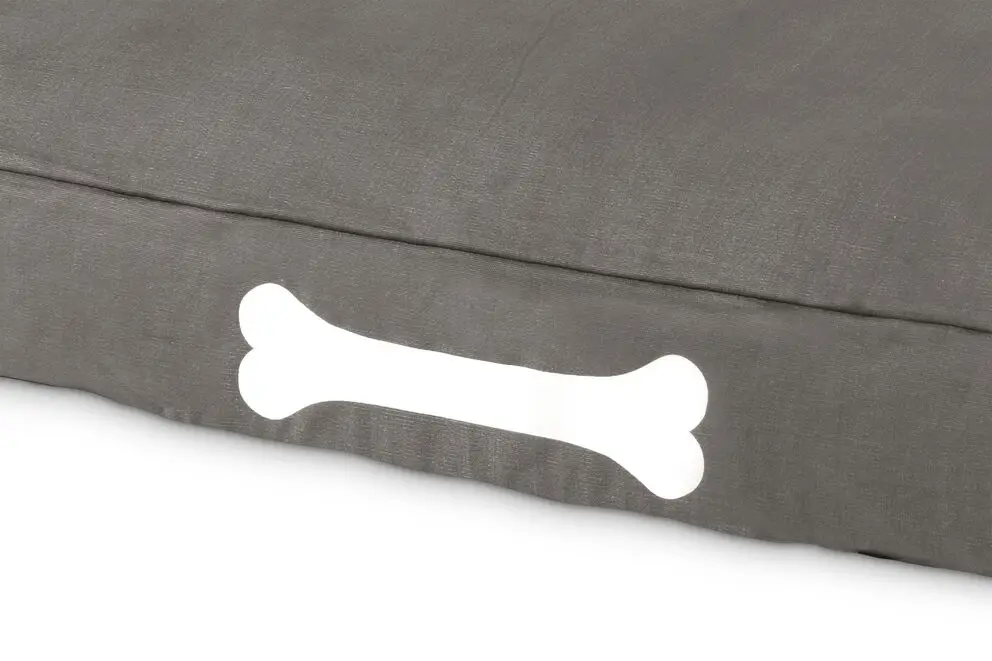 Denne rummelige hundepude i størrelsen 80 × 120 × 15 cm er fremstillet af 100 % genbrugs-polyester. Med sin vægt på 4,82 kg og det karakteristiske hvide ben-design på siden får du en stabil og miljøvenlig hvileplads til din store hund.