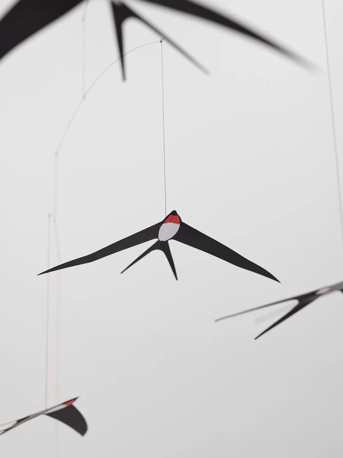 Sød mobile med 5 svaler fra Flensted hanging art. Hæng fx uroen over puslebordet, i vinduet eller i et hjørne i et af rummets hjem, hvor du kan nyde de elegante og akrobatiske svaler.