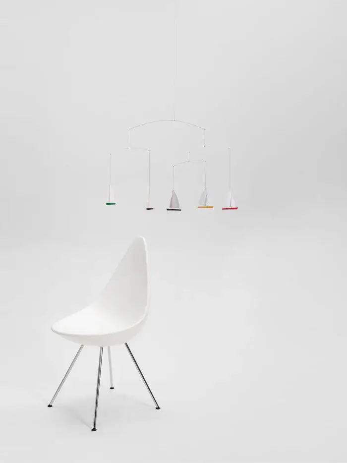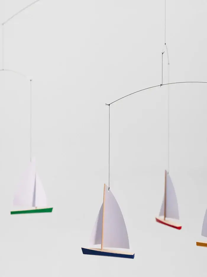 Fin mobile med 5 skibe fra Flensted hanging art. Er du så heldig at have et vindue med havudsigt, kan du hænge uroen op her og betragte, hvordan de 5 skibe bevæger sig imellem hinanden.