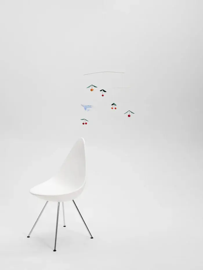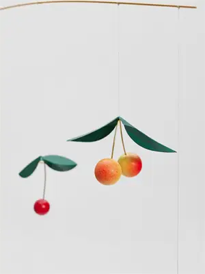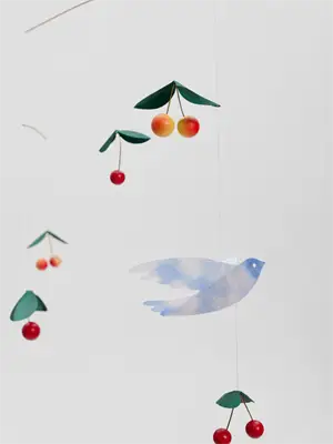 Sommer. En fugl i flugt mellem klynger af modne kirsebær. Som os søger den efter den lækreste frugt. Med ”Kirsebærdrømme” introducerer Flensted Mobiler en elegant mobile, der både er velegnet til børneværelset og til dagligstuen, hvor den hænger og illustrerer sommer og sol.