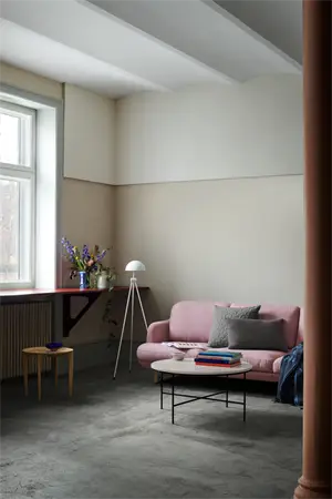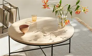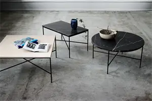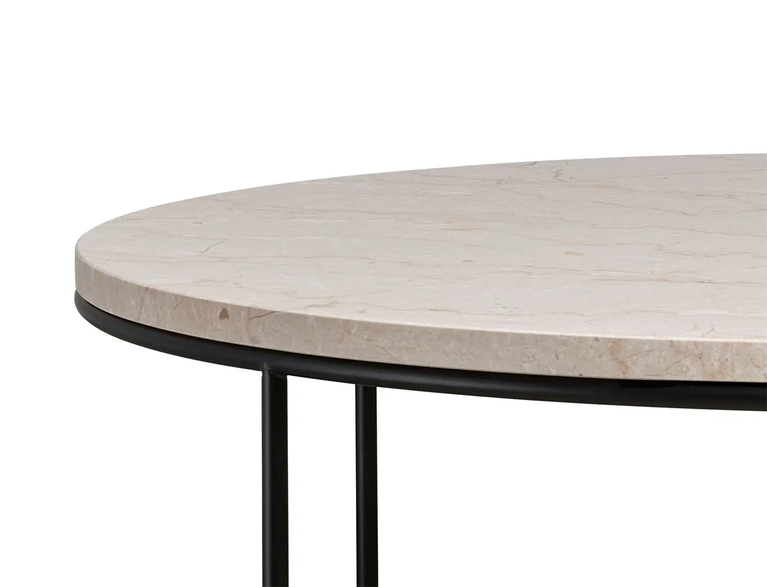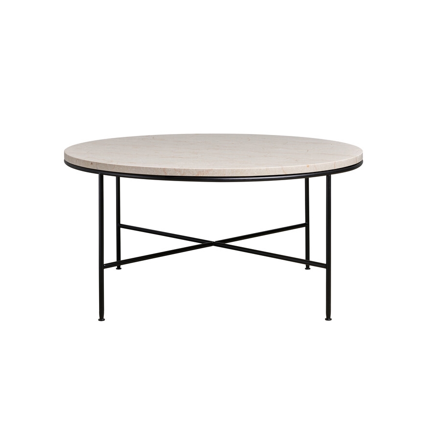 Dette sofabord fra Fritz Hansen kombinerer en rund bordplade i lys cremefarvet marmor med tynde sorte metalben. Diameteren på 80 cm giver plads til både kopper, bøger og dekorative elementer, mens den glatte marmoroverflade er nem at tørre af efter daglig brug.