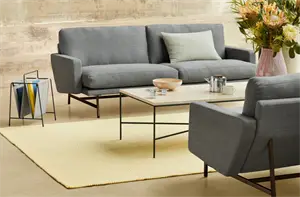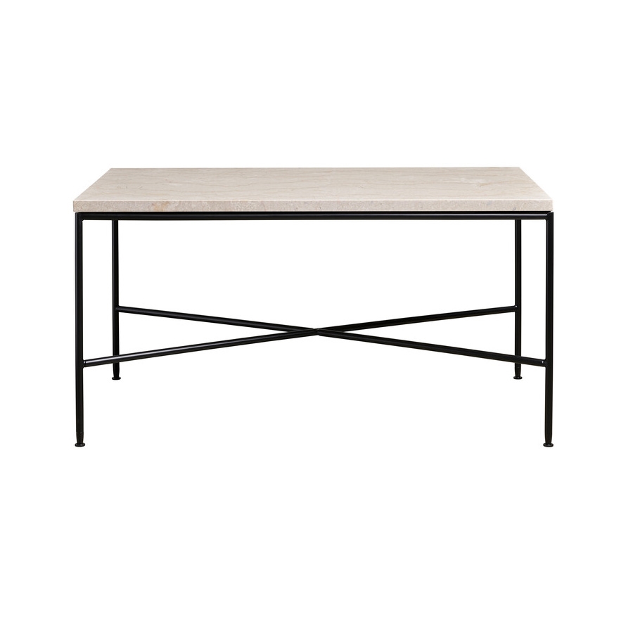 Dette sofabord fra Fritz Hansen har en lys, marmor-lignende overflade, der giver dit rum et stilfuldt udtryk. Bordpladen måler 75x45 cm og sidder i en højde af 40 cm, hvilket passer til sofagrupper. Stellet består af tynde, sorte metalstænger med en krydsstruktur under bordpladen, der sikrer stabilitet.