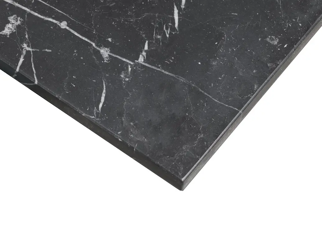 Dette sofabord måler 80x80x40 cm og giver dig en funktionel overflade til daglig brug. Den mørke marmorplade har hvide årer, der skaber en naturlig kontrast. Metalrammen er tynd og holder bordpladen i 40 cm højde, hvilket passer til standardsofaer.