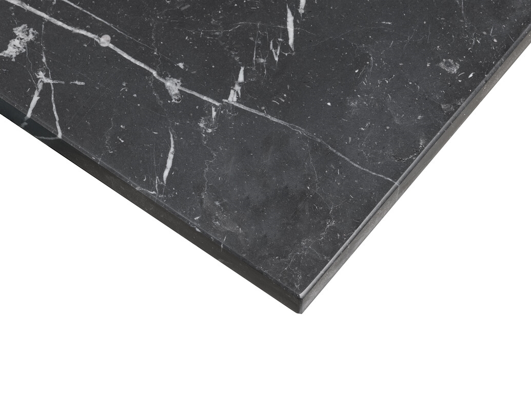 - Bordplade i mørk marmor med charcoal-mønster som centralt element