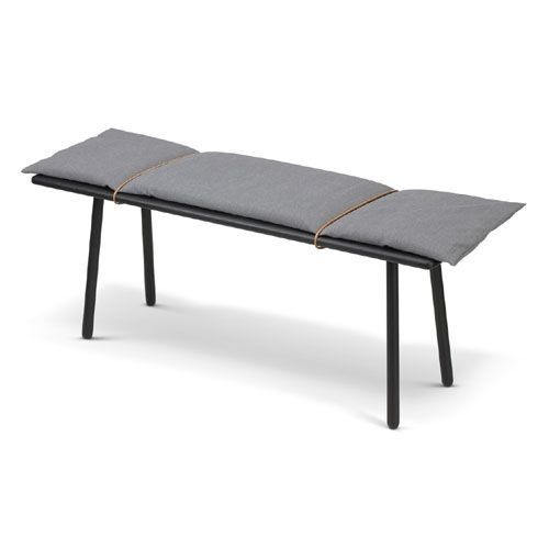 Med et bord der står lænet op ad væggen kommer bænken og træder stærkt frem med den atypiske benstilling og pude i uld holdes fast af lædersnøre.