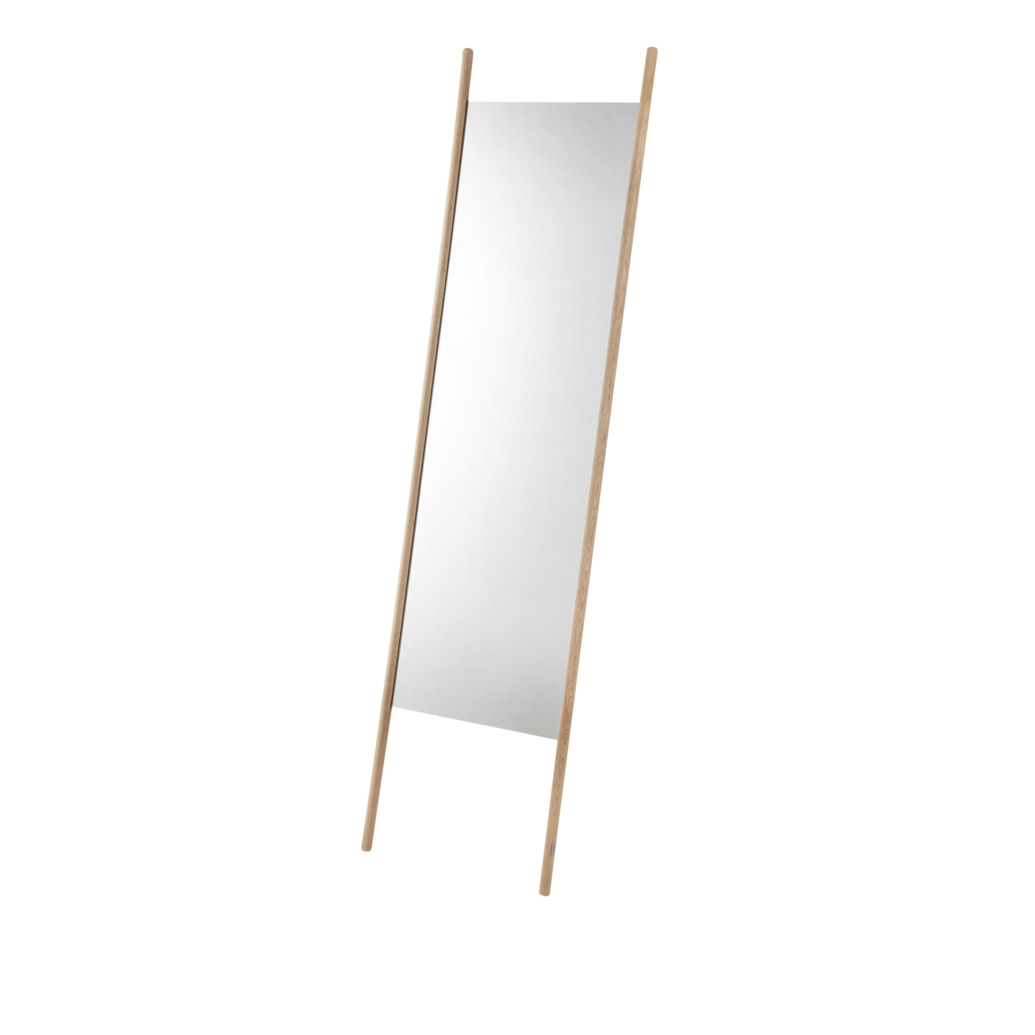 Dette stående spejl er lavet af sort eg og understøttes af to lodrette træstolper på hver side. Materialet giver en naturlig varme og holdbarhed, der passer ind i moderne hjem, hvor man værdsætter ægte håndværk og funktionelt design.