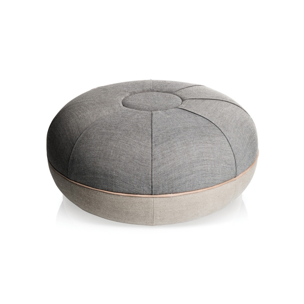 Denne puf kombinerer uld, linned og en læderkant til en robust konstruktion med en behagelig tekstur. Materialerne er håndplukket for deres holdbarhed og komfort, hvilket sikrer, at poufen bevarer sin form og æstetiske appel over tid. Den centrale knapdetalje og syningerne opdeler overfladen i sektioner.