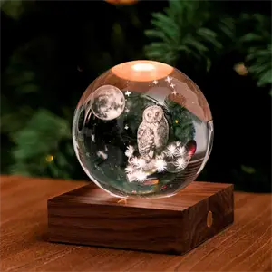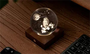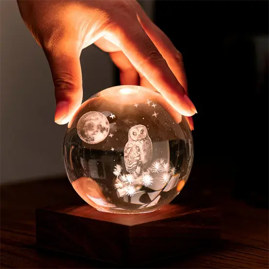 Denne bordlampe kombinerer kunst med funktionel belysning gennem sit 3D-laserprintede krystaldesign. Uglen og månen er præcist indgraveret i krystalkuglen, hvilket skaber en skulpturel effekt, når lyset tændes. Basen er lavet af FSC-certificeret valnøddetræ, hvilket sikrer en bæredygtig oprindelse.