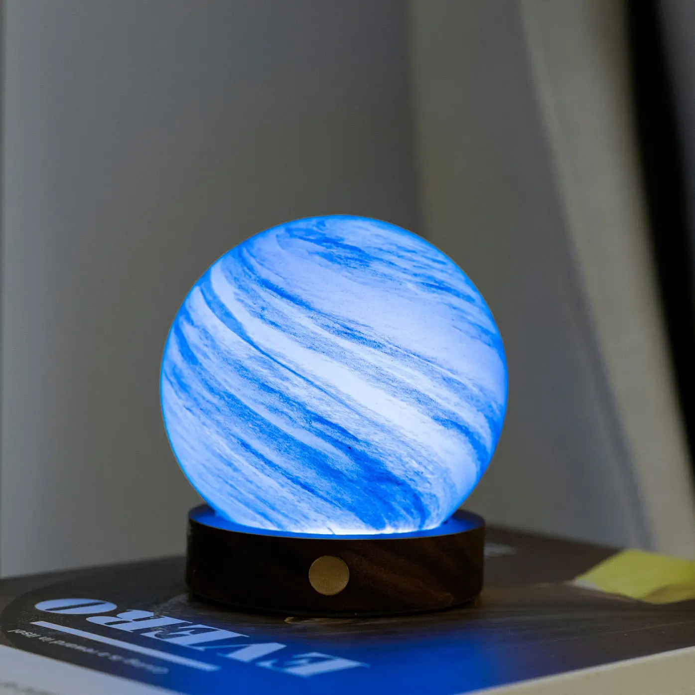 Denne skulpturelle bordlampe måler 8 x 9 cm og kombinerer valnød og glas i et blå- og hvidmarmoreret design. Med smart touch-funktion styrer du lyset direkte på basen, hvilket giver dig nem adgang til både varmt lys og RGB-farver.