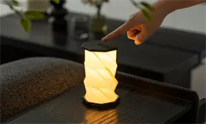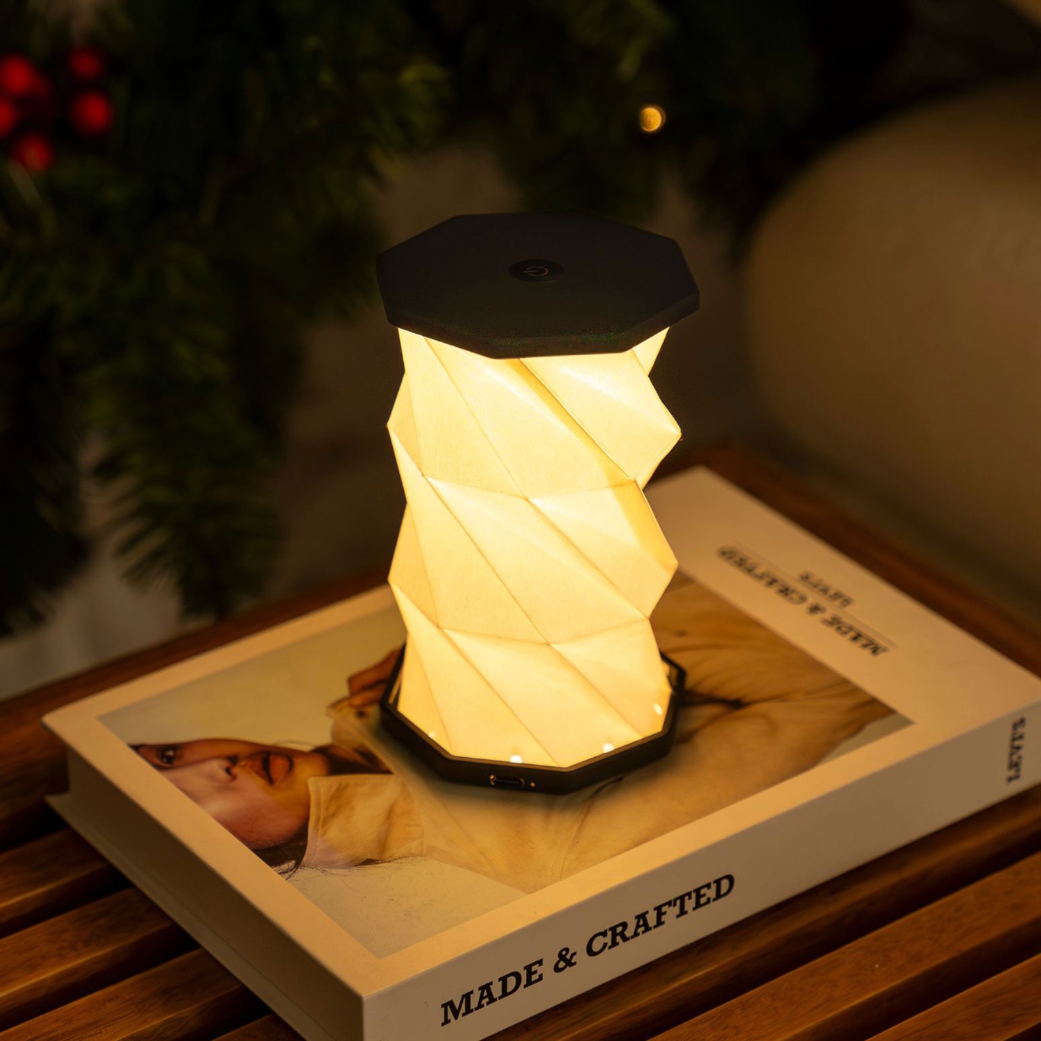 Det hexagonale, snoede design gør denne lampe til mere end bare en lyskilde. Dens kompakte størrelse og skulpturelle form passer naturligt ind på små flader, mens det genopladelige batteri betyder, at du ikke er bundet til stikkontakter. Materialevalget af ABS og slidstærkt papir sikrer holdbarhed, mens den matte slate black-finish giver et moderne udtryk.