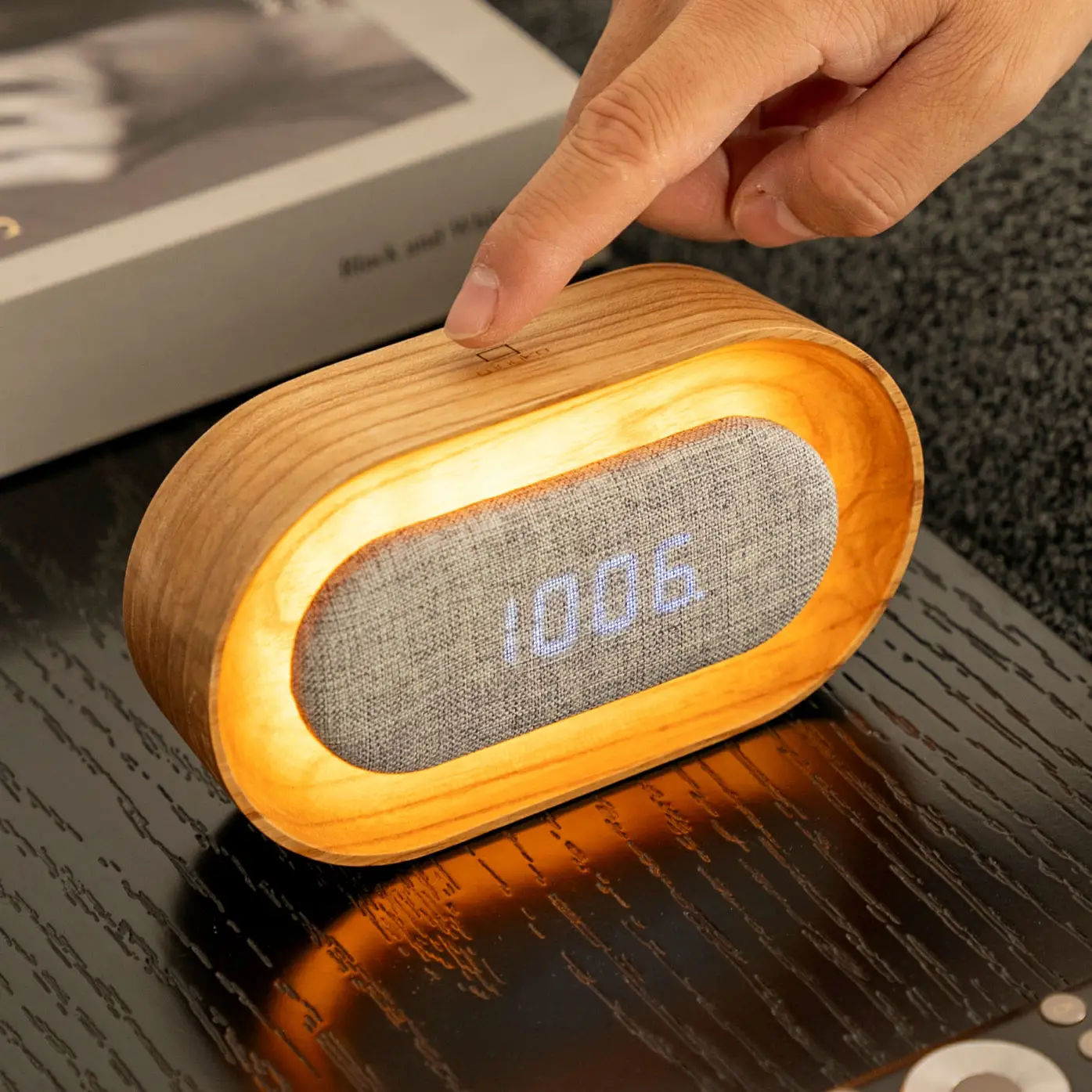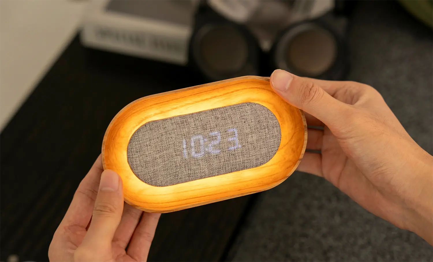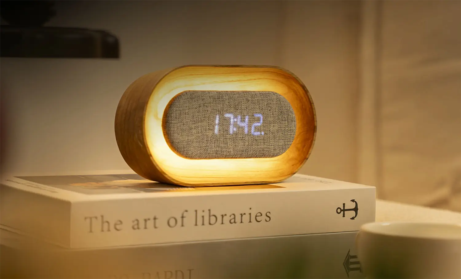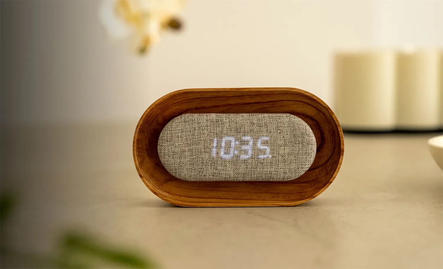 Touch-funktionen betyder, at du ikke skal fumle med knapper om morgenen eller natten. Den digitale tidsvisning med lysende tal er let at aflæse, selv i mørket. Den ovale form med tekstiloverflade passer naturligt ind i moderne indretning, mens den lysende ramme tilføjer et diskret designelement.
