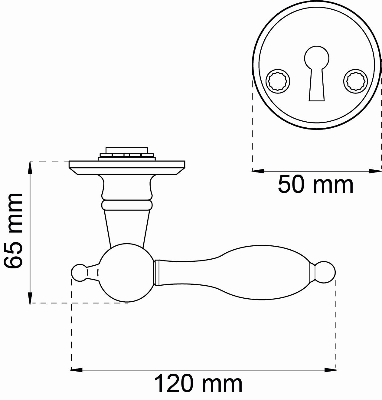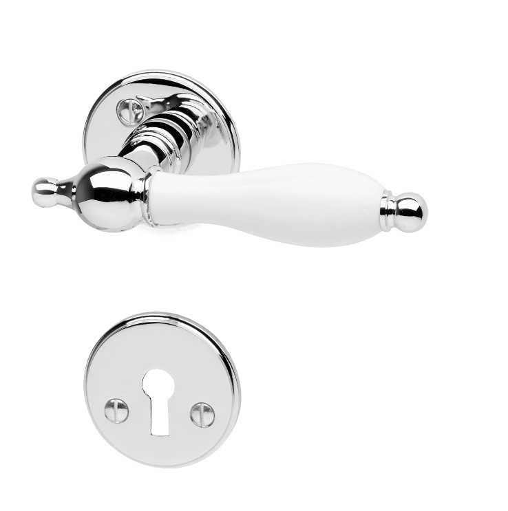 Dørgreb af forkromet messing med hvidlakeret trægreb. Leveres med 5 mm stopskruer. Passer til dørtykkelse 38-42 mm. Fremspring 65 mm.