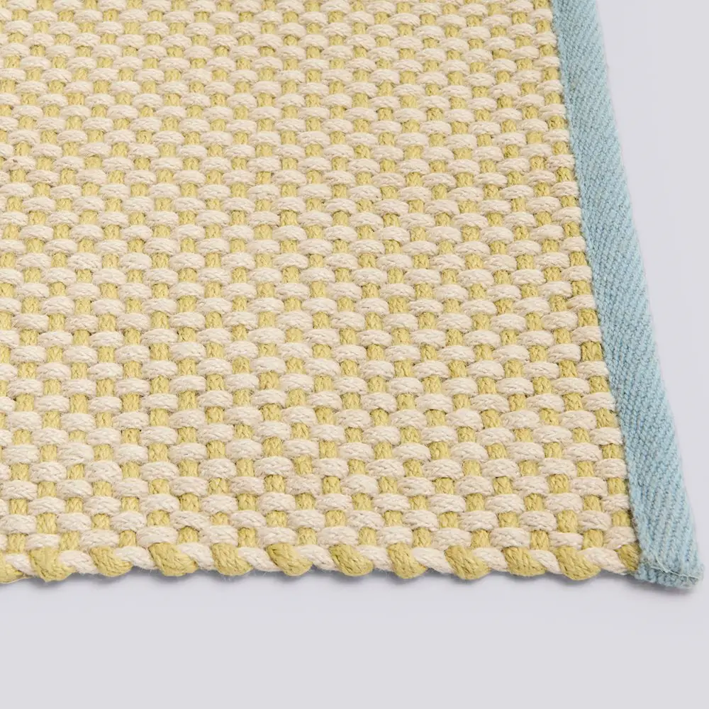 Dette håndvævede tæppe kombinerer 90% jute og 10% uld i en harmonisk blanding. Den bløde gule hovedfarve med blå kant skaber en karakteristisk kontrast, mens den vævede tekstur tilfører dybde og karakter til dit rum.