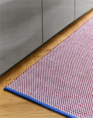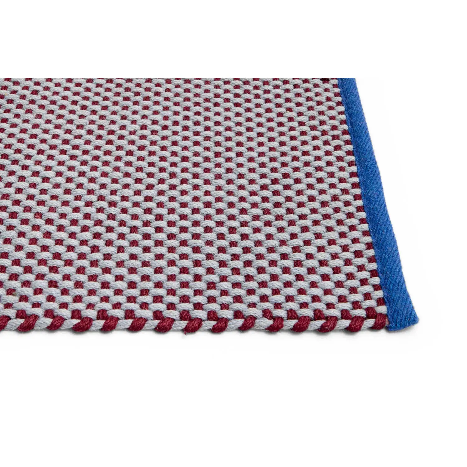 Et håndværksmæssigt tæppe fra Hay, der kombinerer lysegrå og bordeaux i et vævet mønster med en karakteristisk blå kant. Med sine 200x300 cm dækker tæppet et større gulvareal og skaber en naturlig base for din indretning.