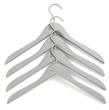 Bøjler fra Hay af træ og coated med gummi. De sorte bøjler fremstår stramt og stringent som noble elementer i garderober og klædeskabe. Brug bøjlerne til ophængning af skjorter, bukser eller kan med fordel bruges i din entré.