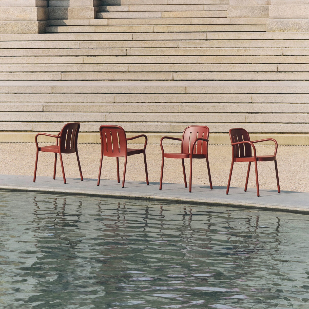 Deville Armchair er lavet af robust jern i en jernrød farve, der holder til udendørs brug året rundt. Materialet tåler vejr og vind, mens farven tilføjer et moderne udtryk til din terrasse eller have. Armlænene strækker sig fra forbenene til ryglænet og giver god støtte, når du sidder.