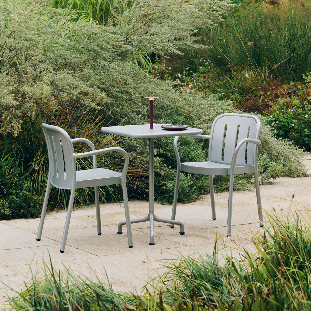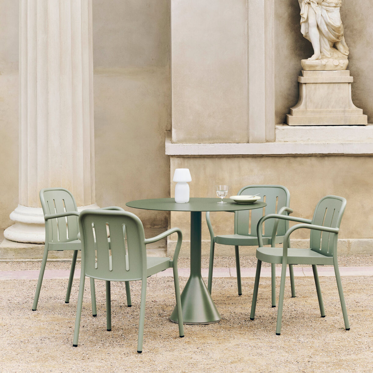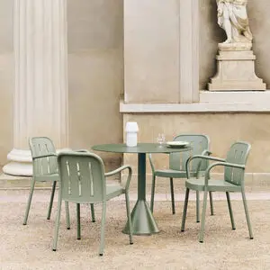 Den thymegrønne farve fungerer som en neutral base, der kan kombineres med forskellige udendørs indretningsstile. Ryglænets tre lodrette åbninger og de afrundede armlæn giver stolen et moderne udtryk, der passer til dem, der søger funktionelle møbler med et kunstnerisk twist til deres udendørs sammenkomster.
