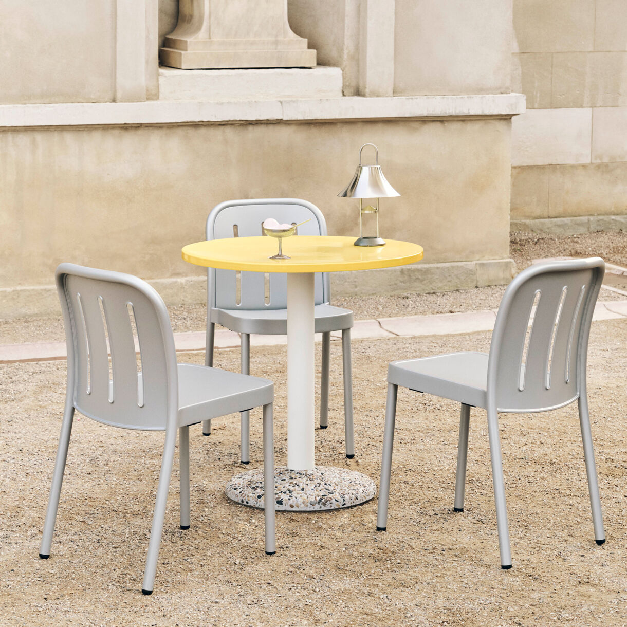 Deville Chair fra Hay kombinerer funktionelt design med moderne æstetik. De fire cylindriske ben giver stolen stabilitet, mens ryglænet med tre vertikale åbninger sikrer ventilation og støtte. Designet af Julien Renault i den lyse grønne farve Thyme Green.