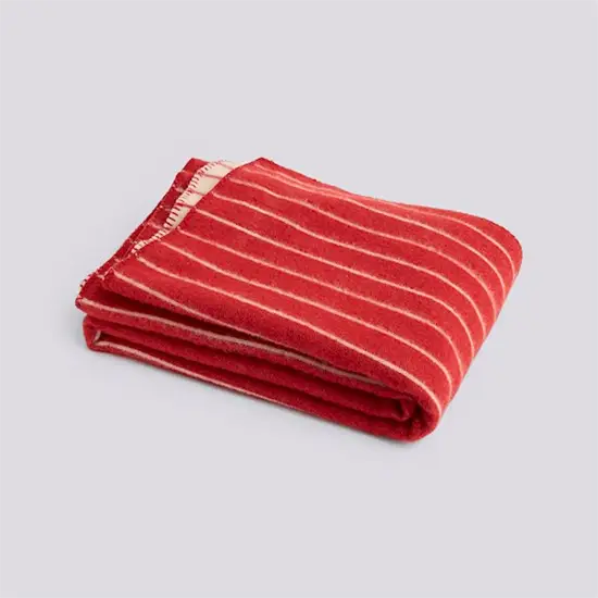 Dette tæppe fra Hay kombinerer funktionalitet med et karakteristisk design i rød med beige striber. Det måler 130 cm i bredde og 180 cm i længde, hvilket giver god plads til udendørs brug eller som et ekstra lag på køligere aftener.