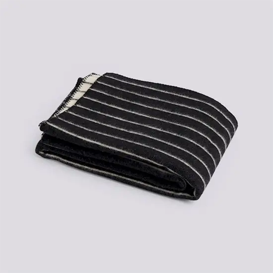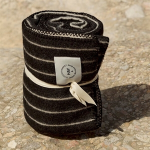 Dette tæppe fra HAY er lavet af 100 % uld og måler W130 x L180 cm. Ulden giver naturlig varme og holder godt over tid, selv ved udendørs brug. Kanten har en syet finish, som sikrer holdbarhed. Det sorte design med beige striber passer til mange forskellige udendørsindretninger.