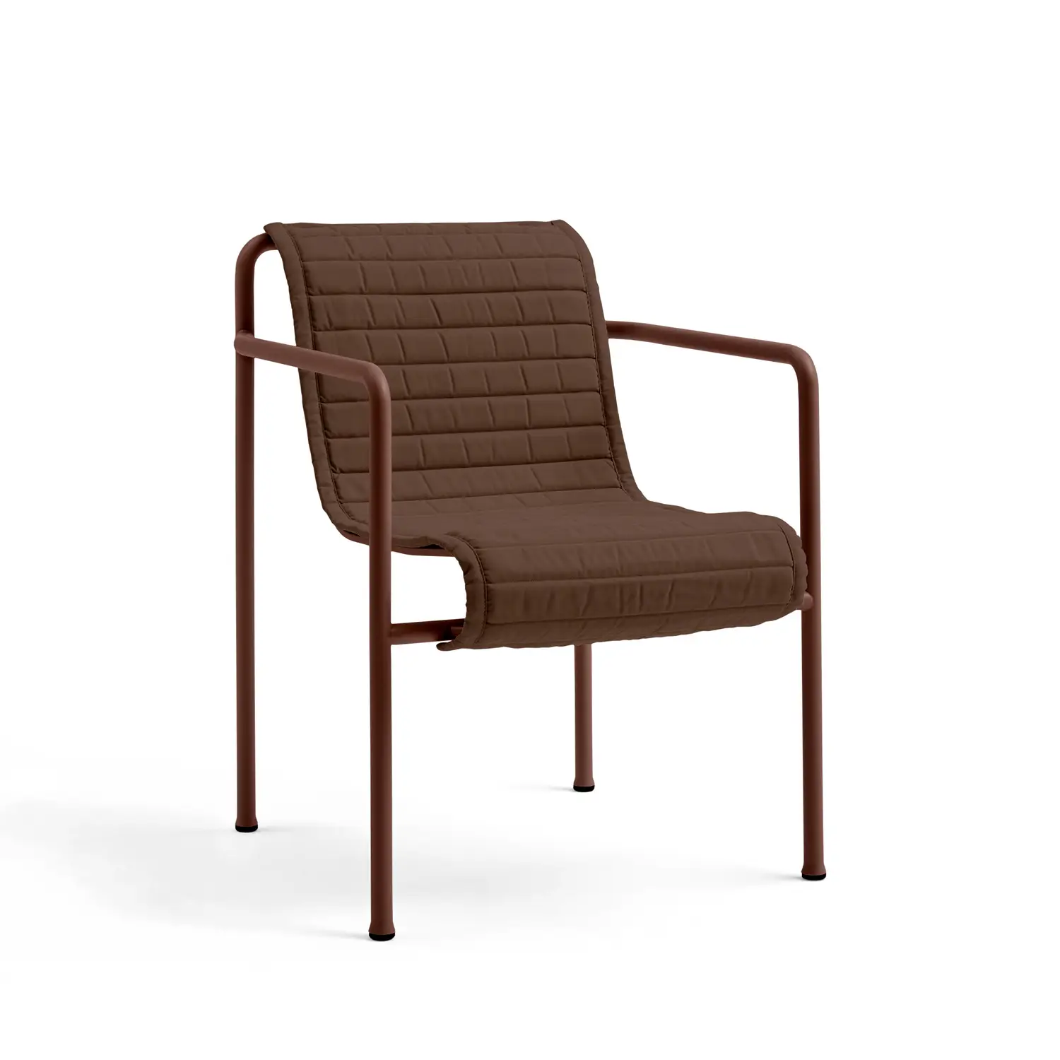 Det quiltede mønster med parallelle syninger giver hynden et raffineret udtryk, mens den jernrøde farve tilfører et moderne præg. Tykkelsen på 1 cm sikrer god siddekomfort uden at kompromittere stolens design.