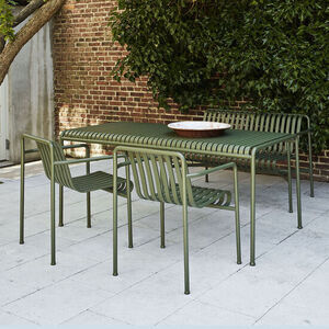 Dette havebord fra Hay kommer i en karakteristisk olivengrøn farve, der giver dit udendørs rum et moderne og naturligt udtryk. Det slanke design med slatted overflade og lige ben passer ind i både moderne og klassiske haveindretninger.