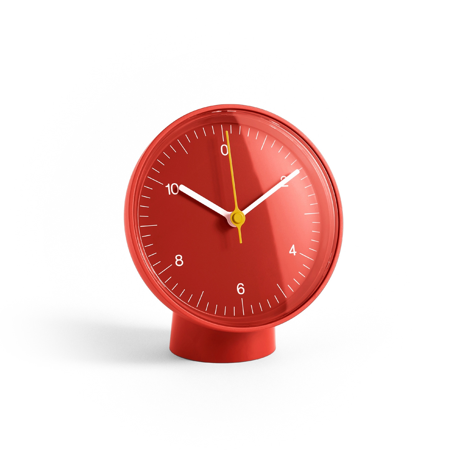Med sine kompakte mål på B13 x D8 x H14,5 cm finder uret plads på skrivebordet, reolen eller natbordet. Tallene 0, 2, 4, 6, 8 og 10 er trykt på urskiven, hvilket gør det nemt at aflæse tiden. De hvide time- og minutvisere samt den gule sekundviser skaber en klar kontrast mod den røde baggrund.