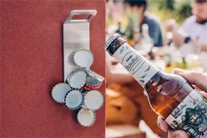 Det børstede rustfrie stål giver produktet en holdbar overflade, der tåler daglig brug uden at ruste. Materialet passer ind i de fleste køkkener og baromgivelser med sin neutrale finish. Monteringen kræver intet værktøj – det dobbeltklæbende 3M-tape gør, at du kan sætte åbneren op på få sekunder uden at bore huller.