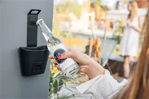 Monteringen kræver ingen skruer eller huller i væggen. Det dobbeltklæbende 3M-klæbebånd sikrer, at åbneren sidder fast på de fleste overflader. Åbneren i børstet rustfrit stål med sort PVD-belægning giver både et diskret udseende og modstandsdygtighed over for daglig brug.