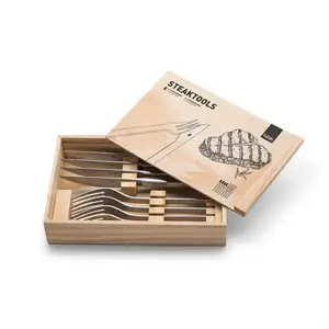 Sættet leveres i en trækasse af høj kvalitet, som beskytter værktøjerne og gør opbevaringen nem. Materialet er satineret og børstet rustfrit stål, som holder sig pænt over tid. De præcise dimensioner på 25,0 x 17,0 x 4,5 cm gør sættet kompakt nok til både hjemmet og campingturen.