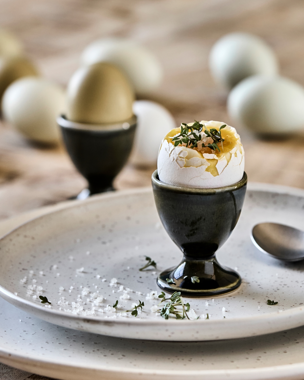Sæt et sofistikeret præg på dit spisebord med disse håndlavede keramiske æggebægre. De er fremstillet af stentøj, og deres mørkegrønne, blanke glasur giver en elegant nuance, der passer til ethvert stel. Bægrene passer perfekt ind i forskellige stilarter og er både alsidige og charmerende. Det omhyggelige håndværk sikrer ikke kun æstetisk appel, men også praktisk funktionalitet, hvilket gør dem til en tidløs tilføjelse til dit spisestel.- Håndlavet keramisk design- Mørkegrøn blank glasur- Sættet indeholder 4 dele- Supplerer ethvert serviceSæt et sofistikeret præg på din madoplevelse med disse udsøgte æggebægre.